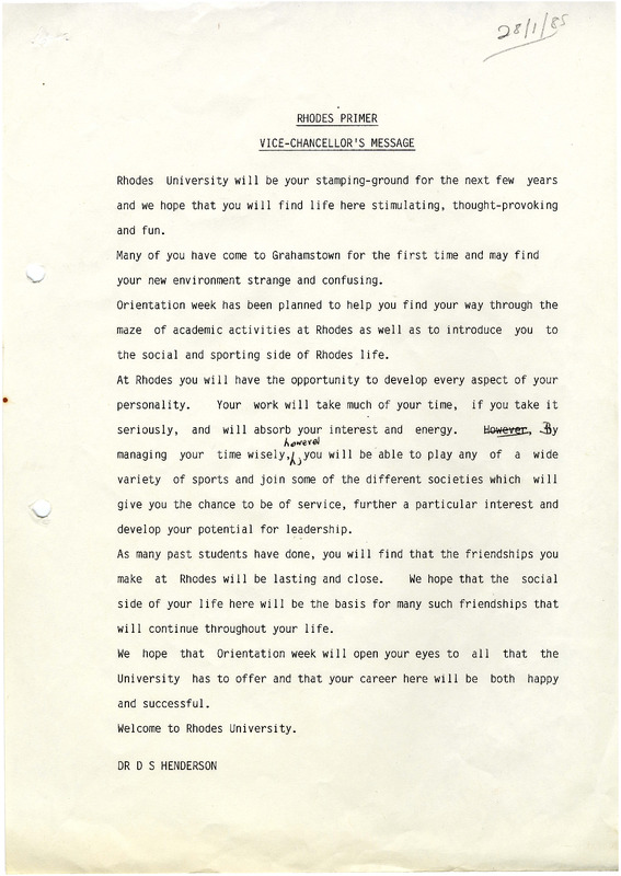 Henderson, Derek Scott, “Rhodes primer: Vice-Chancellor's message”, Rhodes University History Archive, accessed 30 December 2025, https://digitalarchives.ru.ac.za/s/ruha/item/15525