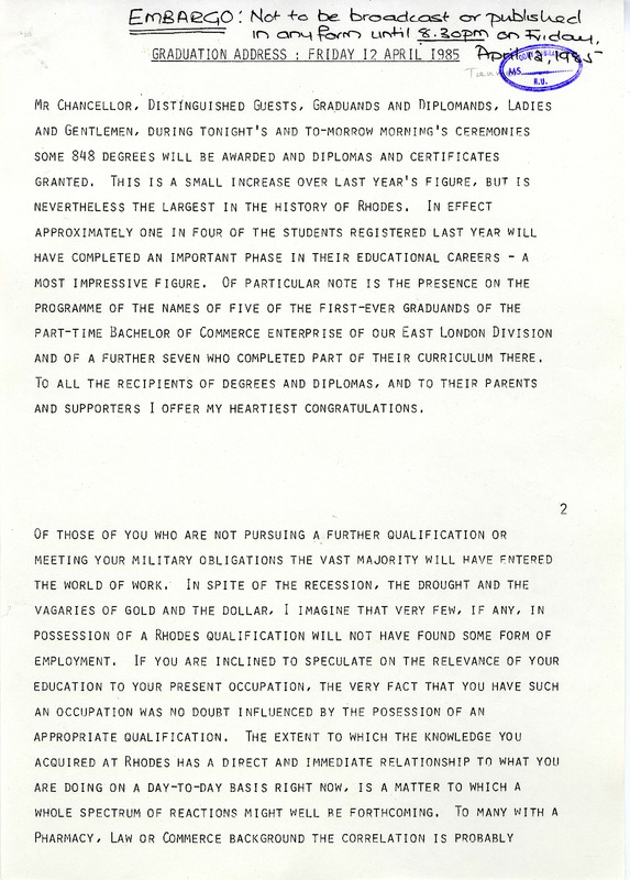 Henderson, Derek Scott, “Rhodes University 1985 Graduation Ceremonies Address”, Rhodes University History Archive, accessed 30 December 2025, https://digitalarchives.ru.ac.za/s/ruha/item/15533