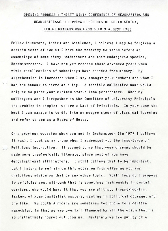- Opening address: 39th Conference of Headmasters and Headmistresses of Private Schools of South Africa