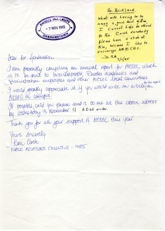 Henderson, Derek Scott, “Message from the Vice-Chancellor to Rhodes AISEC review 1984 - 85”, Rhodes University History Archive, accessed 30 December 2025, https://digitalarchives.ru.ac.za/s/ruha/item/15571