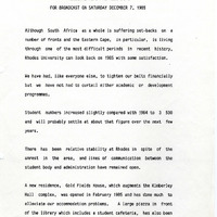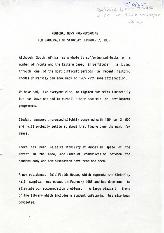 Henderson, Derek Scott, “Regional news pre-recording for broadcast on Saturday December 7, 1985”, Rhodes University History Archive, accessed 30 December 2025, https://digitalarchives.ru.ac.za/s/ruha/item/15581