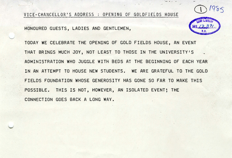 Henderson, Derek Scott, “Vice-Chancellor's address: opening of Goldfield's house”, Rhodes University History Archive, accessed 30 December 2025, https://digitalarchives.ru.ac.za/s/ruha/item/15589