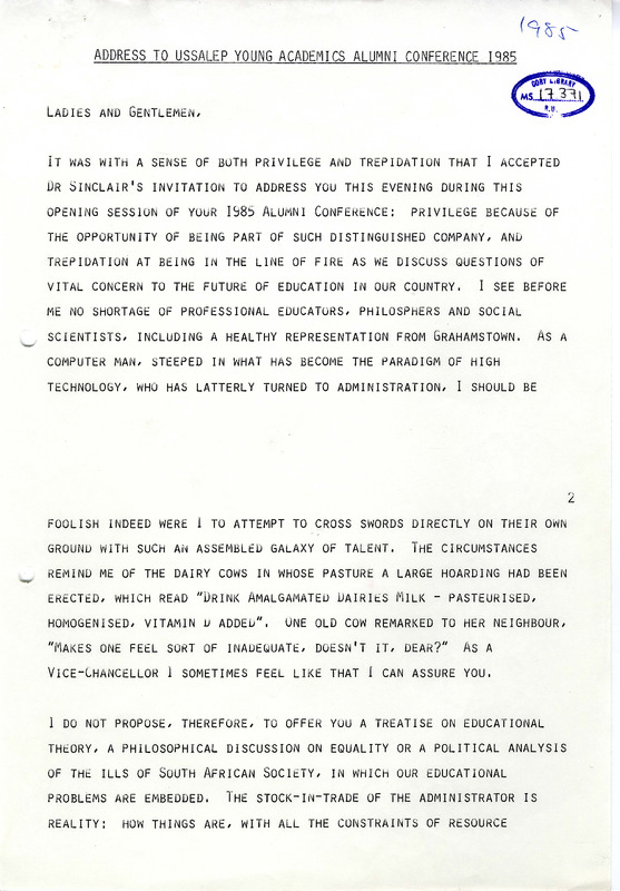 - Address to USSALEP Young Academics Alumni Conference 1985
