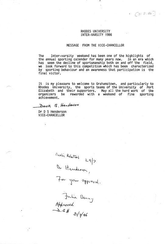 Henderson, Derek Scott, “Message from the Vice-Chancellor”, Rhodes University History Archive, accessed 30 December 2025, https://digitalarchives.ru.ac.za/s/ruha/item/15615