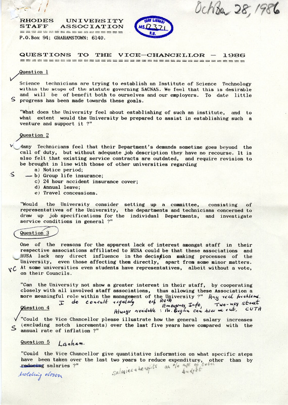Henderson, Derek Scott, “Questions to the Vice-Chancellor 1986”, Rhodes University History Archive, accessed 30 December 2025, https://digitalarchives.ru.ac.za/s/ruha/item/15645
