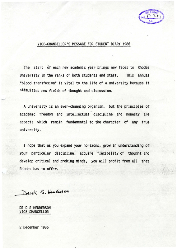Henderson, Derek Scott, “Message for student diary 1986”, Rhodes University History Archive, accessed 30 December 2025, https://digitalarchives.ru.ac.za/s/ruha/item/15647