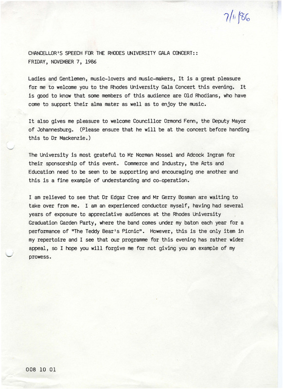 Henderson, Derek Scott, “Chancellor's speech for the Rhodes University gala concert”, Rhodes University History Archive, accessed 30 December 2025, https://digitalarchives.ru.ac.za/s/ruha/item/15651