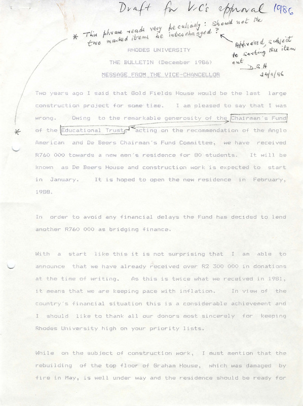 Henderson, Derek Scott, “Message from the Vice-Chancellor, bulletin, draft”, Rhodes University History Archive, accessed 30 December 2025, https://digitalarchives.ru.ac.za/s/ruha/item/15653