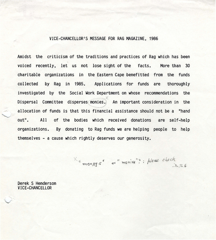 Vice-Chancellor's message for rag magazine, 1986
