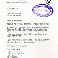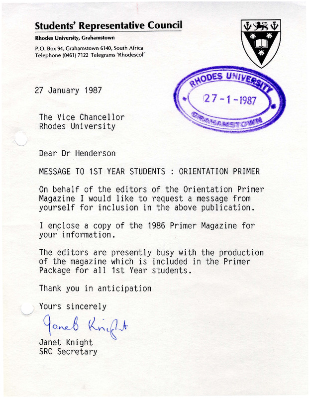 Henderson, Derek Scott, “Message to 1st year students in orientation primer”, Rhodes University History Archive, accessed 30 December 2025, https://digitalarchives.ru.ac.za/s/ruha/item/15665