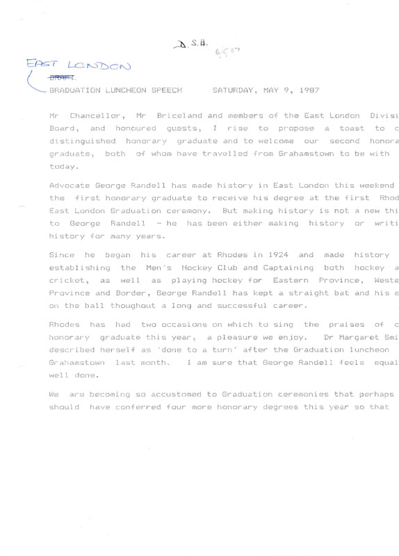Henderson, Derek Scott, “East London graduation luncheon speech, 1987, draft”, Rhodes University History Archive, accessed 30 December 2025, https://digitalarchives.ru.ac.za/s/ruha/item/15679