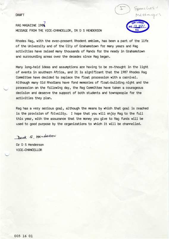 Henderson, Derek Scott, “Message from the Vice-Chancellor (draft)”, Rhodes University History Archive, accessed 30 December 2025, https://digitalarchives.ru.ac.za/s/ruha/item/15691
