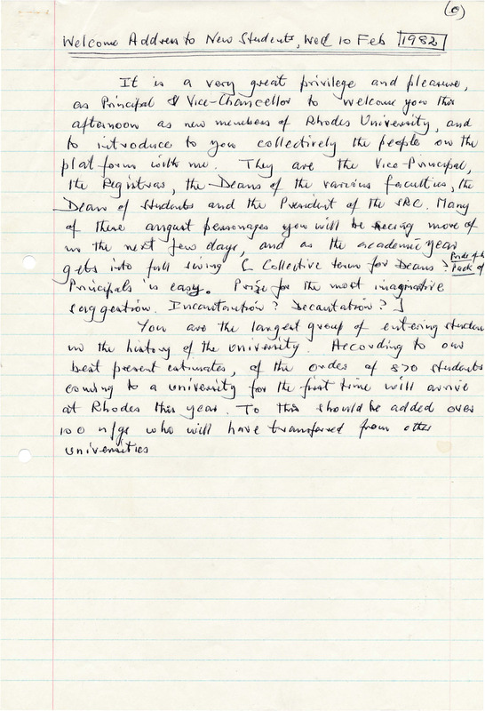 Henderson, Derek Scott, “Welcome address to new students (handwritten)”, Rhodes University History Archive, accessed 30 December 2025, https://digitalarchives.ru.ac.za/s/ruha/item/15701