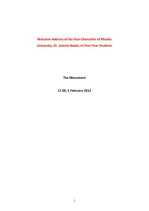- Welcome Address of the Vice-Chancellor of Rhodes University, Dr Saleem Badat, to First-Year students