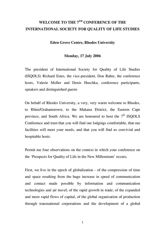 - Welcome address at the 7th Conference of the International Society for Quality-of-Life Studies