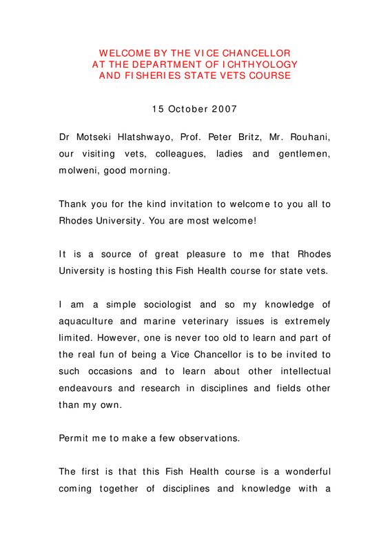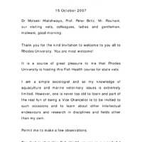 - Welcome address at the Department of Ichthyology and Fisheries State Vets Course, 2007
