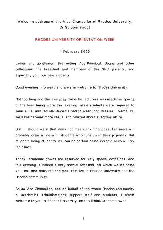 - Welcome address of the Vice-Chancellor of Rhodes University, Dr Saleem Badat