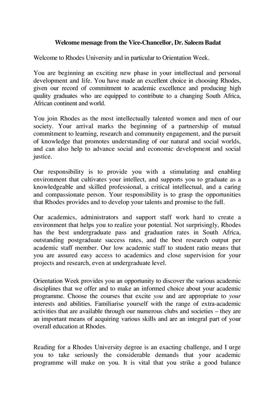 - Welcome message from the Vice-Chancellor, Dr. Saleem Badat