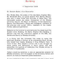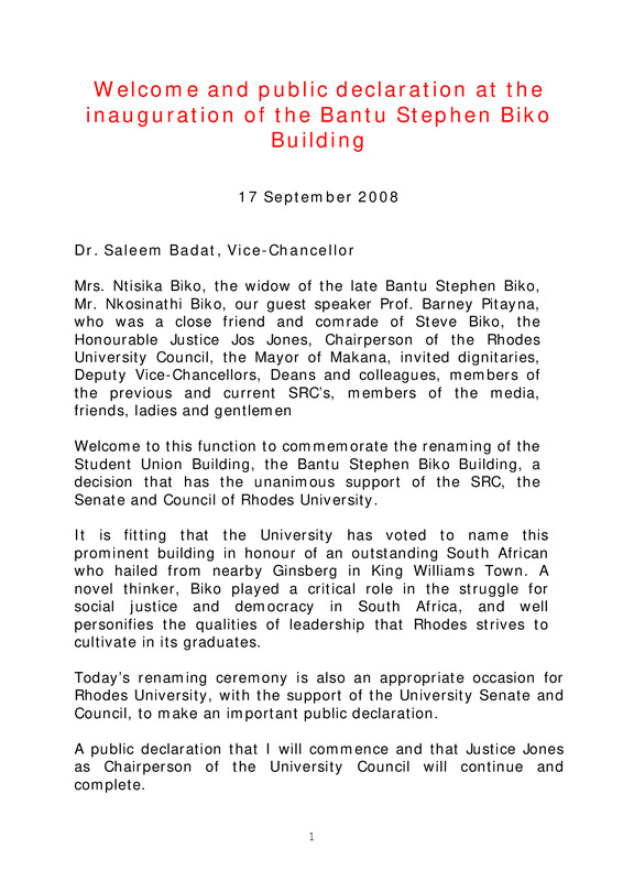 - Welcome and public declaration at the inauguration of the Bantu Stephen Biko Building