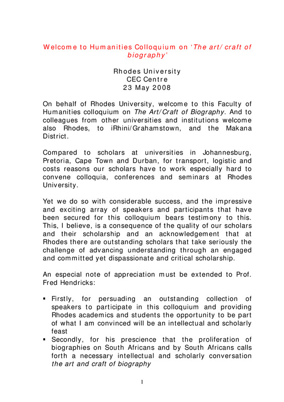 Badat, Saleem, “Welcome to Humanities Colloquium on The art/craft of biography”, Rhodes University History Archive, accessed 30 December 2025, https://digitalarchives.ru.ac.za/s/ruha/item/15943