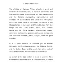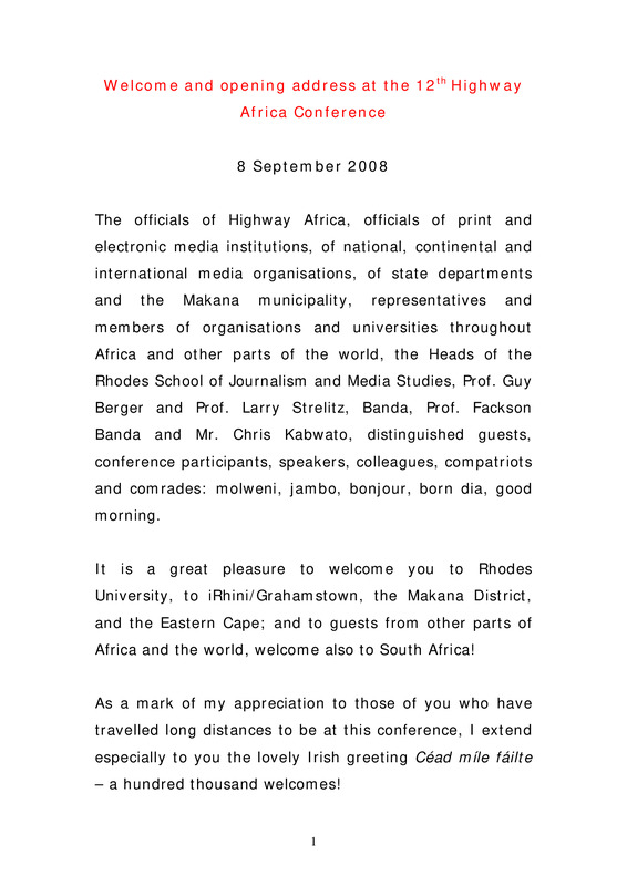 - Welcome and opening address at the 12th Highway Africa Conference