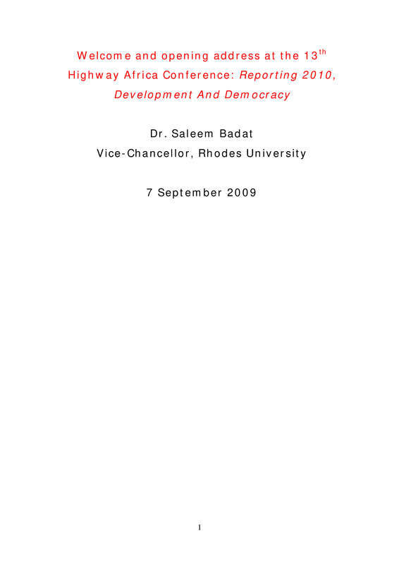 - Welcome and opening address at the 13th Highway Africa Conference: Reporting 2010, Development And Democracy