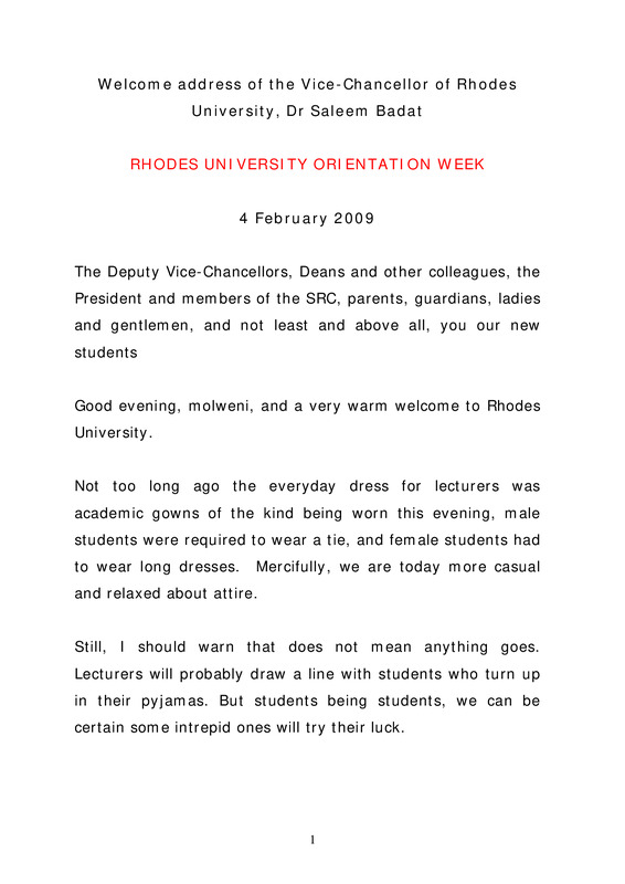 - Welcome address of the Vice-Chancellor of Rhodes University, Dr Saleem Badat
