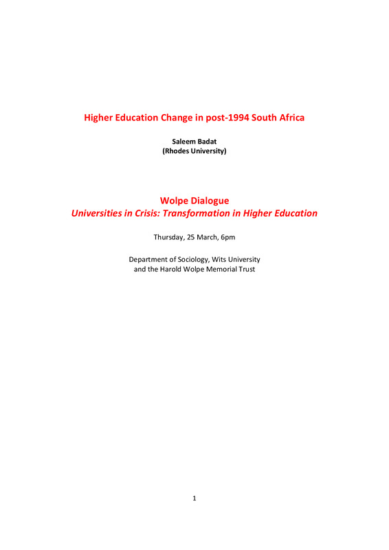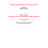 - Wolpe Dialogue : Universities in Crisis: Transformation in Higher Education, Department of Sociology, Wits University and the Harold Wolpe Memorial Trust