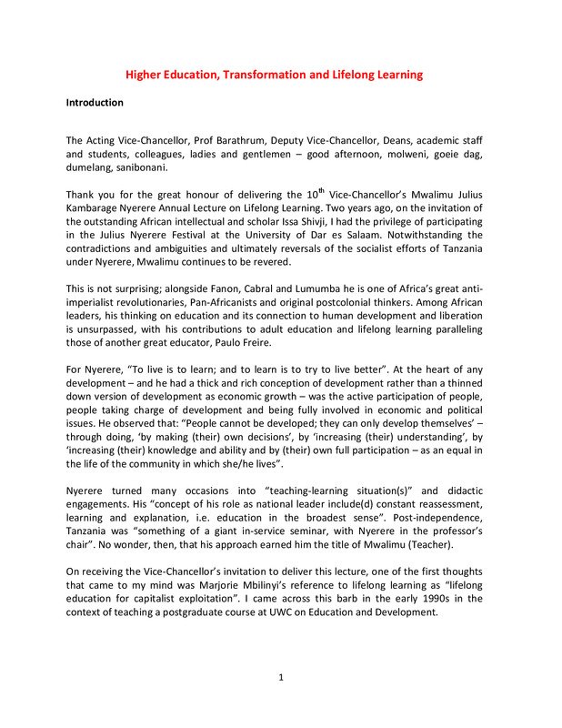 - 10th Vice-Chancellor's Mwalimu Julius Kambarage Nyerere Annual Lecture on Lifelong Learning, University of the Western Cape, 2013