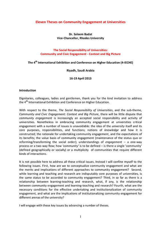 - Eleven Theses on Community Engagement at Universities,The Social Responsibility of Universities: Community and Civic Engagement - Context and Big Picture