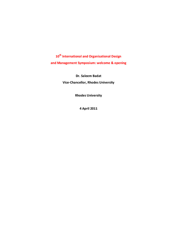 - 10th International and Organisational Design and Management (ODAM) Symposium, Rhodes University, Grahamstown, April 2011