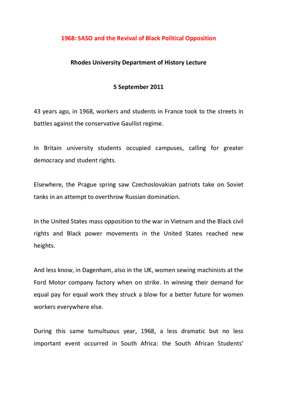 Badat, Saleem, “1968: SASO and the Revival of Black Political Opposition”, Rhodes University History Archive, accessed 30 December 2025, https://digitalarchives.ru.ac.za/s/ruha/item/16179