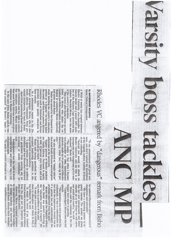 - Varsity boss tackles ANC MP: Rhodes VC angered by ""dangerous"" remark from Bisho