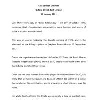 - Book launch 'Black man you are on your own', East London City Hall, Oxford Street, East London, 27 January 2011