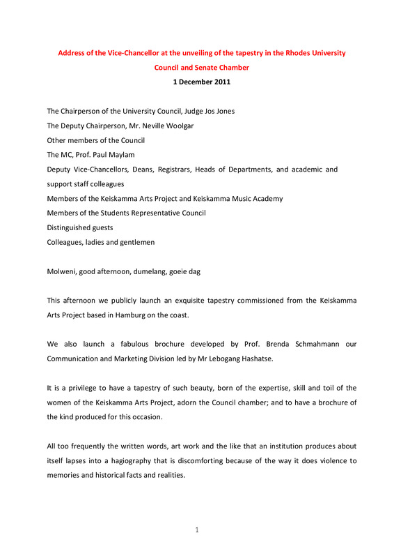 - Address of the Vice-Chancellor at the unveiling of the tapestry in the Rhodes University Council and Senate Chamber