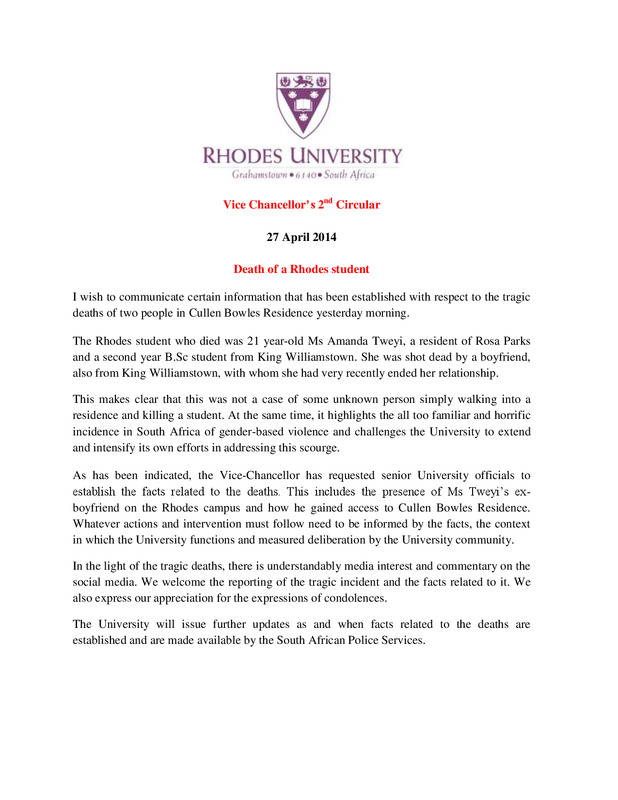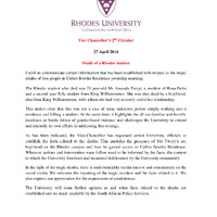 - Vice Chancellor's 2nd circular death of a Rhodes student