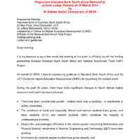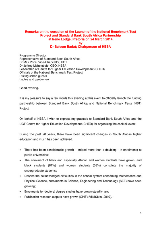 - Remarks on the occasion of the launch of the national benchmark test project and Standard Bank South Africa partnership at Irene lodge, Pretoria on 24 March 2014