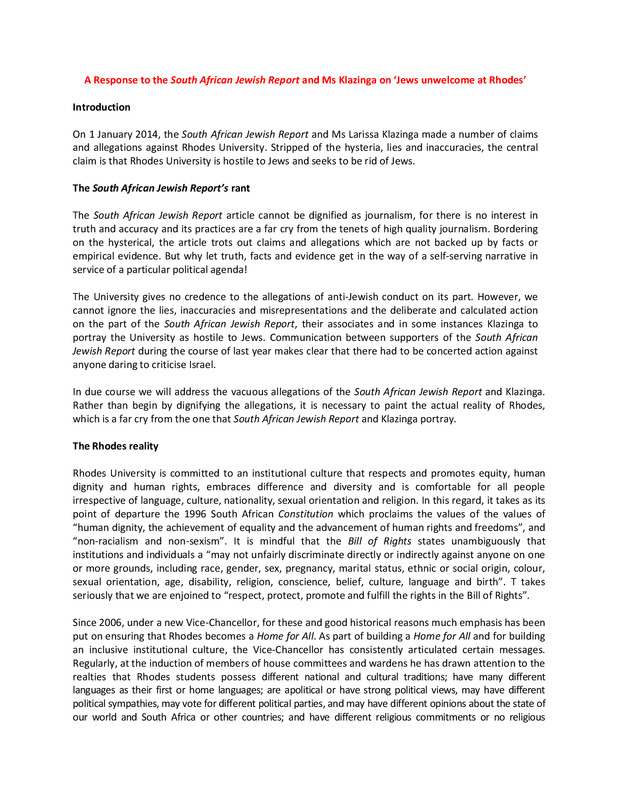 - A response to the South African Jewish report and Ms Klazinga on "Jews unwelcome at Rhodes"