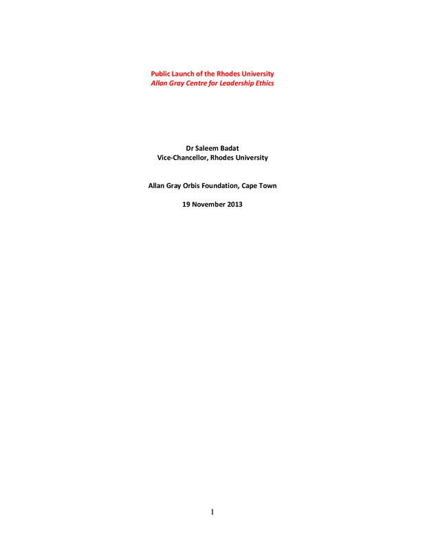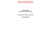 Badat, Saleem, “Public launch of the Rhodes University Allan Gray centre for leadership ethics”, Rhodes University History Archive, accessed 30 December 2025, https://digitalarchives.ru.ac.za/s/ruha/item/16333