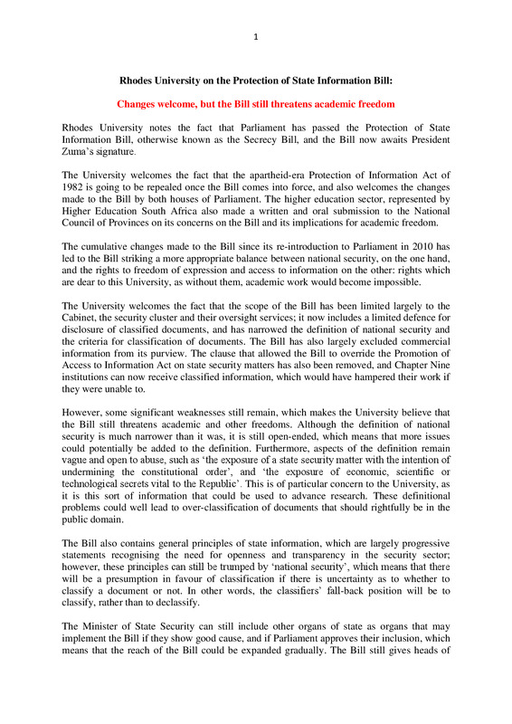 - Rhodes University on the protection of state information bill: Changes welcome, but the bill still threatens academic freedom