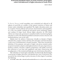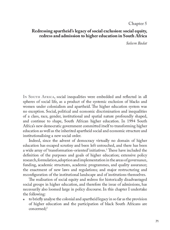 - Redressing apartheid's legacy of social exclusion: social equity, redress and admission to higher education in South Africa