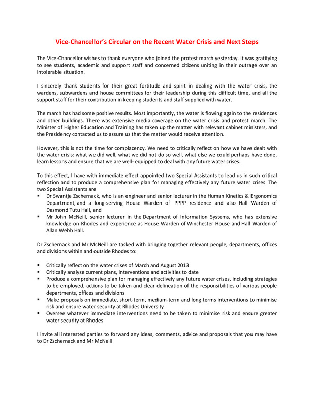 - Vice-Chancellor's circular on the recent water crisis and next steps