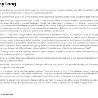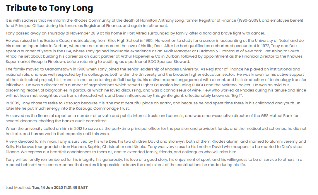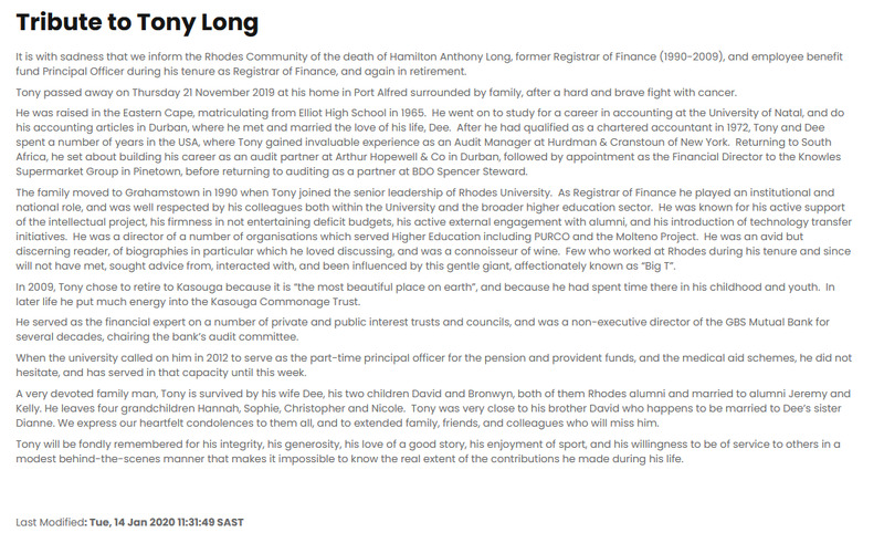 It is with sadness that we inform the Rhodes Community of the death of Hamilton Anthony Long, former Registrar of Finance (1990-2009), and employee benefit fund Principal Officer during his tenure as Registrar of Finance, and again in retirement.