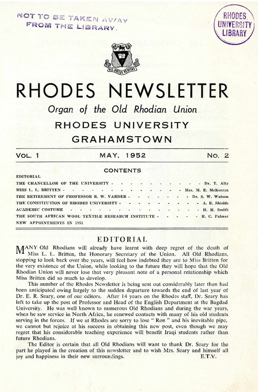 Rhodes University, Grahamstown, South Africa, “Rhodes Newsletter: Vol. 1, No. 2”, Rhodes University History Archive, accessed 29 December 2025, https://digitalarchives.ru.ac.za/s/ruha/item/7318