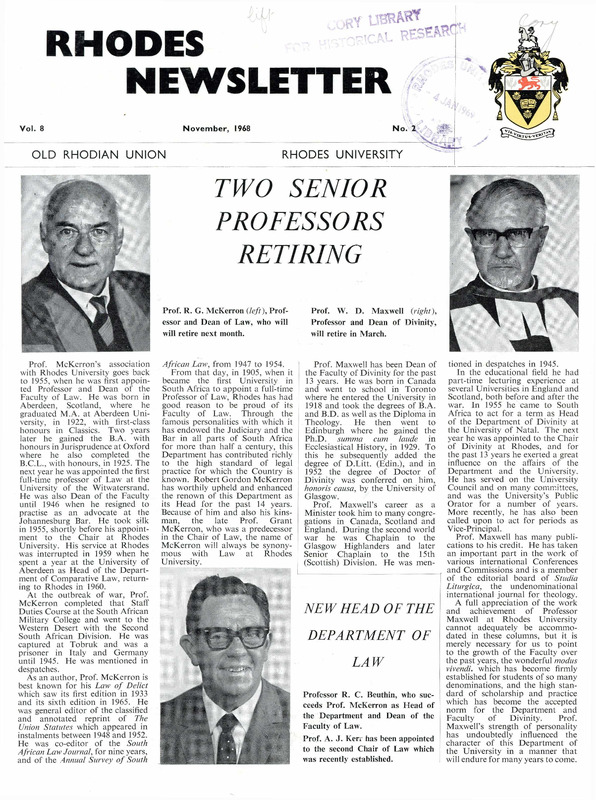 Rhodes University, Grahamstown, South Africa, “Rhodes Newsletter: Vol. 8, No. 2”, Rhodes University History Archive, accessed 29 December 2025, https://digitalarchives.ru.ac.za/s/ruha/item/7346