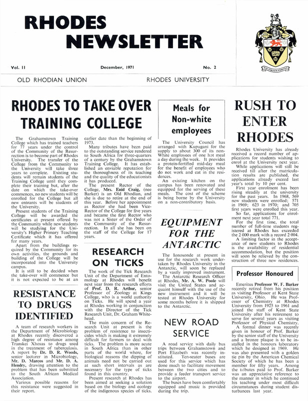 Rhodes University, Grahamstown, South Africa, “Rhodes Newsletter: Vol. 11, No. 2”, Rhodes University History Archive, accessed 29 December 2025, https://digitalarchives.ru.ac.za/s/ruha/item/7358