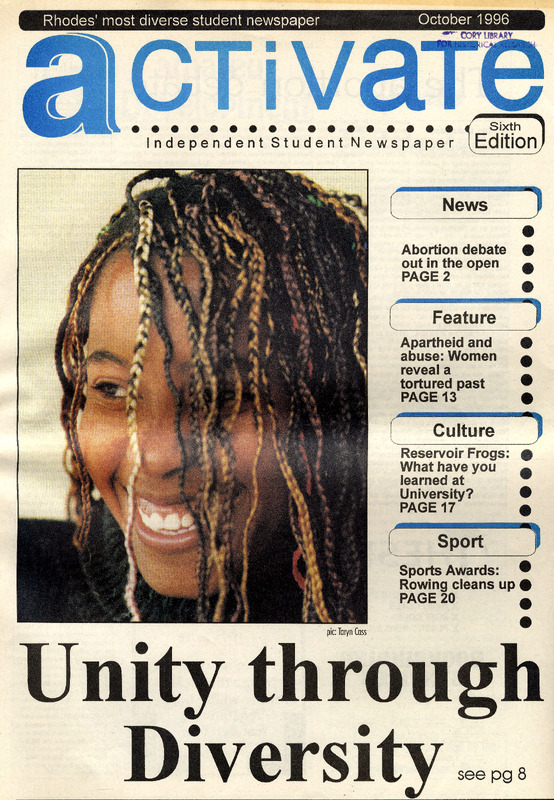 Rhodes University, Grahamstown, South Africa, “Activate: 1996 - October”, Rhodes University History Archive, accessed 29 December 2025, https://digitalarchives.ru.ac.za/s/ruha/item/7478
