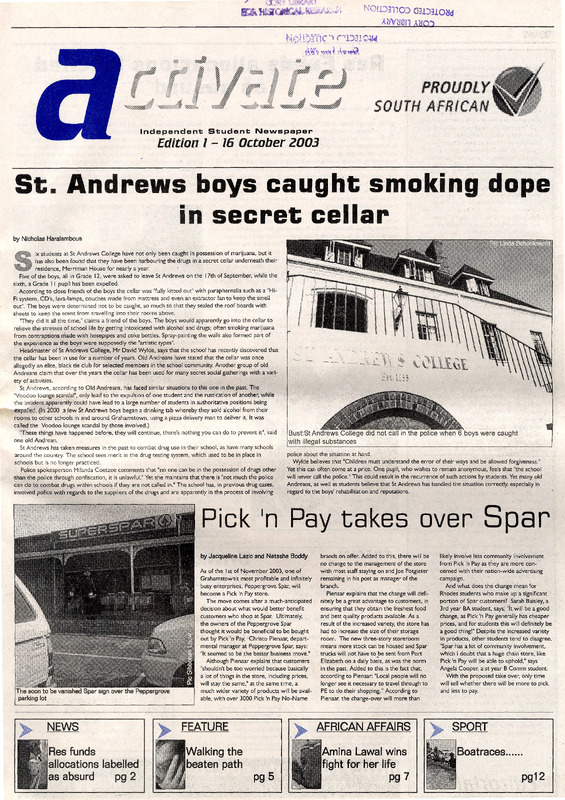 Rhodes University, Grahamstown, South Africa, “Activate: 2003 - October”, Rhodes University History Archive, accessed 29 December 2025, https://digitalarchives.ru.ac.za/s/ruha/item/7566