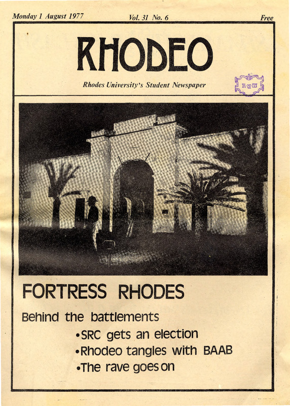 Rhodes University, Grahamstown, South Africa, “Rhodeo, Vol. 31, No. 6,Rhodeo: 1977 - August”, Rhodes University History Archive, accessed 29 December 2025, https://digitalarchives.ru.ac.za/s/ruha/item/8346