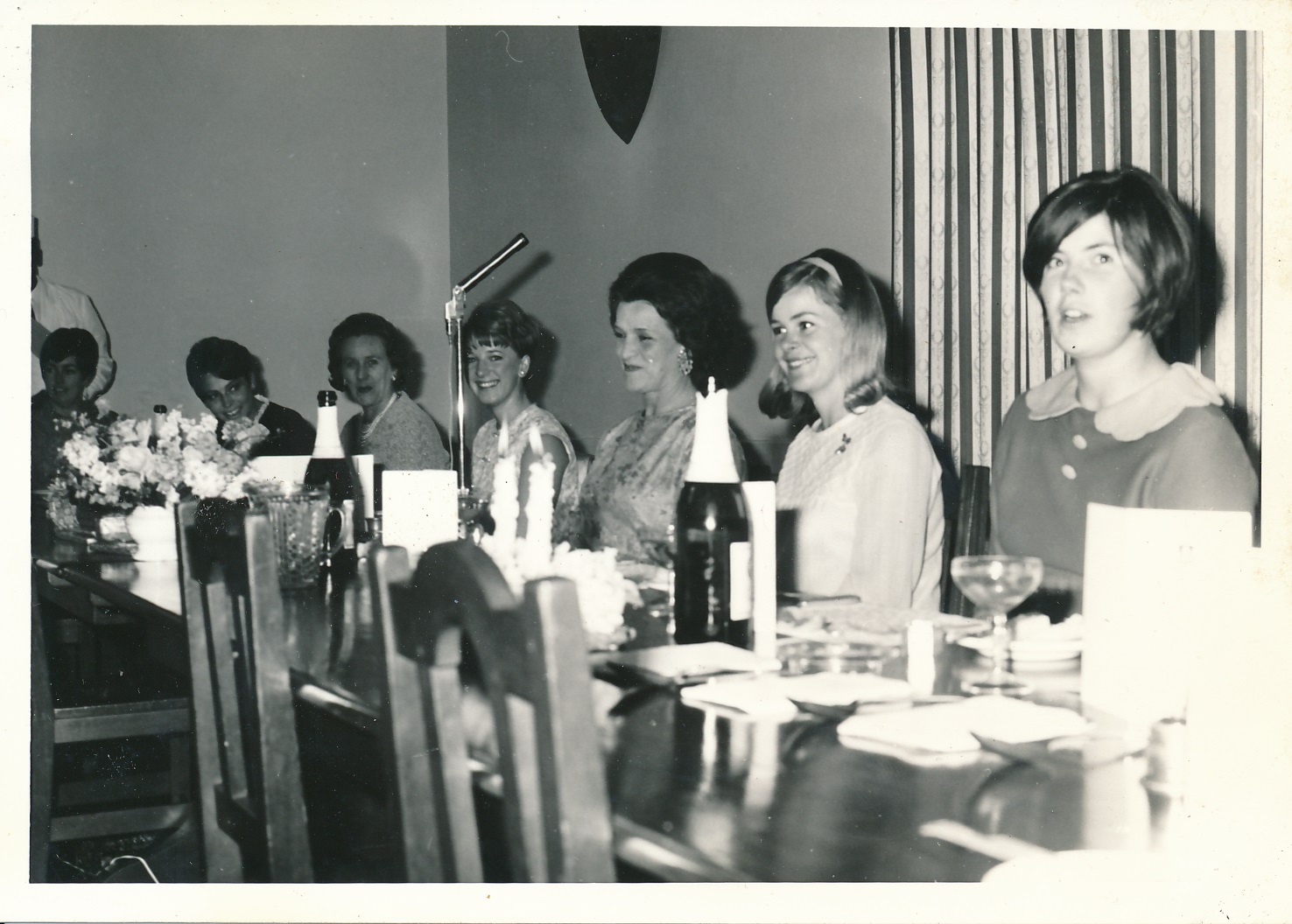 Young women sitting at a table, possibly at the Oriel Hall leaving dinner